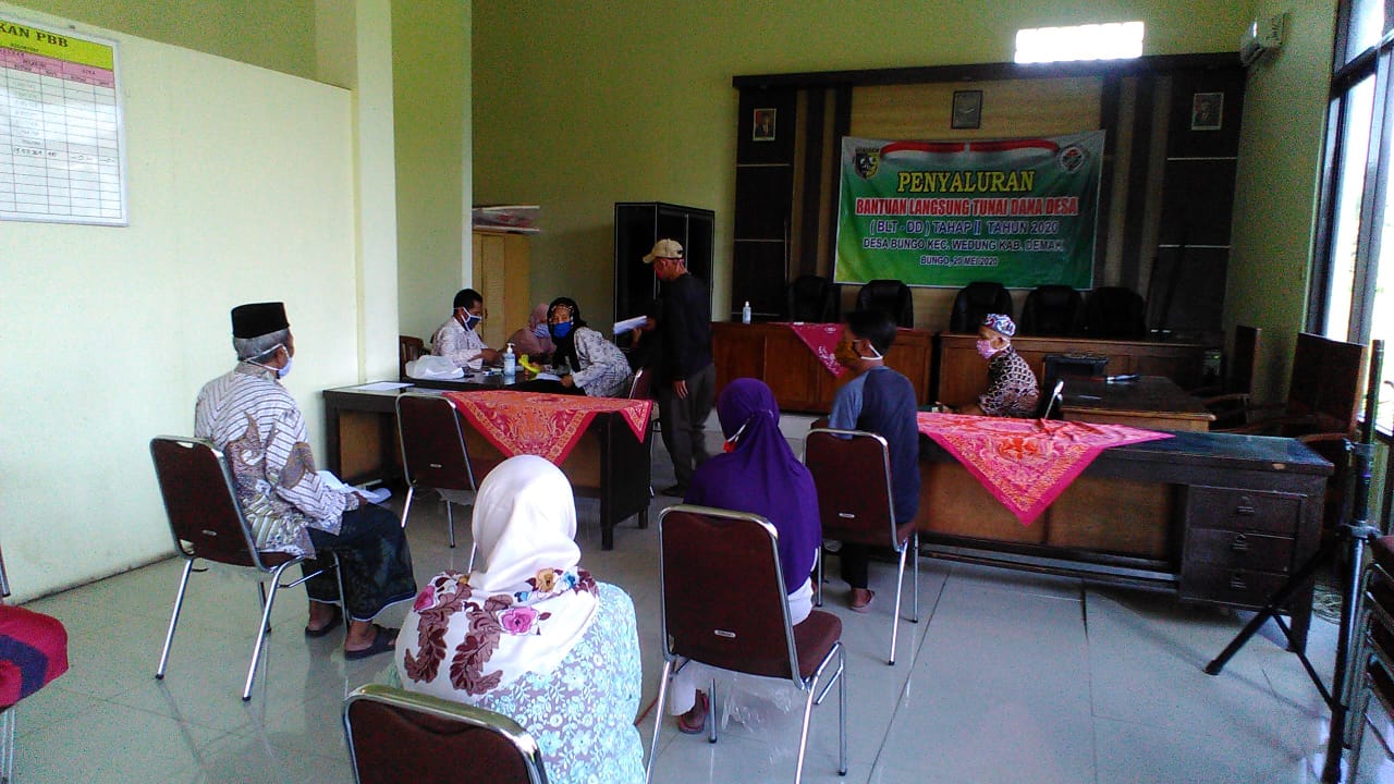 Pada hari Selasa, tanggal 01 Juli 2020 jam 09.00 bertempat di Ruang Pertemuan Balai Desa Bungo Kecamatan Wedung didakan Penyaluran Bantuan BLT DD tahap 2 bagi warga Desa Bungo yang terdampak Cobvid 19, kegiatan ini dipimpin oleh Kepala Desa Bungo Slamet,S.Sos didampingi Forkopimcam Kecamatan Wedung dan diikuti oleh warga penerima bantuan BLT DD tahap 2 Desa Bungo Kecamatan Wedung. Adapun bentuk bantuan ini berupa uang tunai Rp.600.000 per Kepala Keluarga, semoga dengan bantuan ini warga yang terdampak bisa terbantu dan semoga Covid 19 ini bisa cepat hilang.