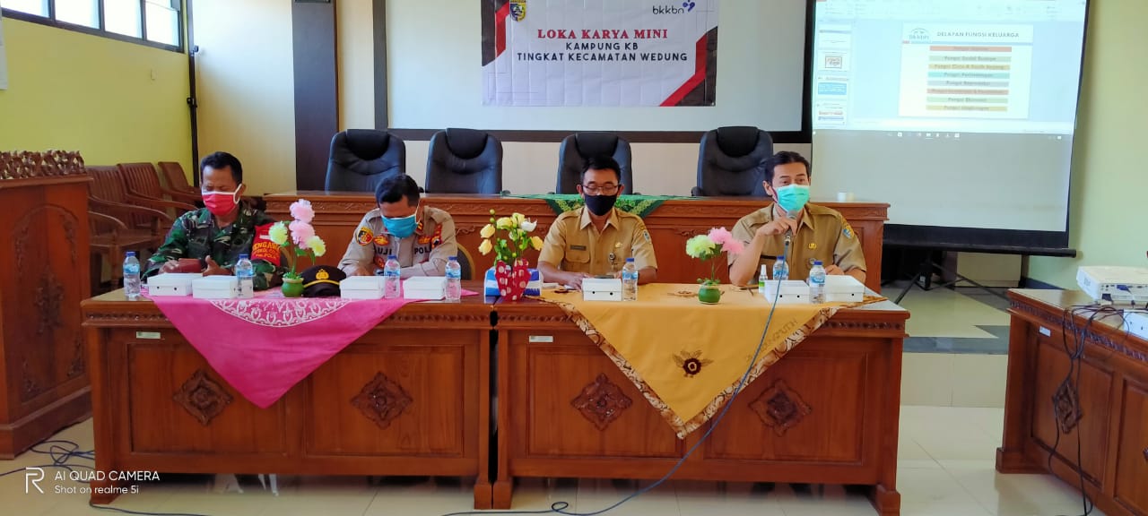 Wedung – Senin, tanggal 27 Juli 2020 jam 09.00 bertempat di Ruang Pertemuan Kantor Kecamatan Wedung didakan Kegiatan Rutin Lokakarya Mini Kampung KB oleh Dinpermades P2KB Kecamatan Wedung, Kegiatan ini dipimpin oleh Sekcam Wedung Drs.Akhmad Suyud, MH didampingi Kapolsek dan Danramil, dengan narasumber Kepala UPTD Dinpermades P2KB Kecamatan Wedung Safikul Umam, isi dari kegiatan ini adalah sosialisasi tentang pencanangan program keluarga berencana, perkembangan kampung kb yang ada di desa dan pertumbuhan penduduk di wilayah Kecamatan Wedung.