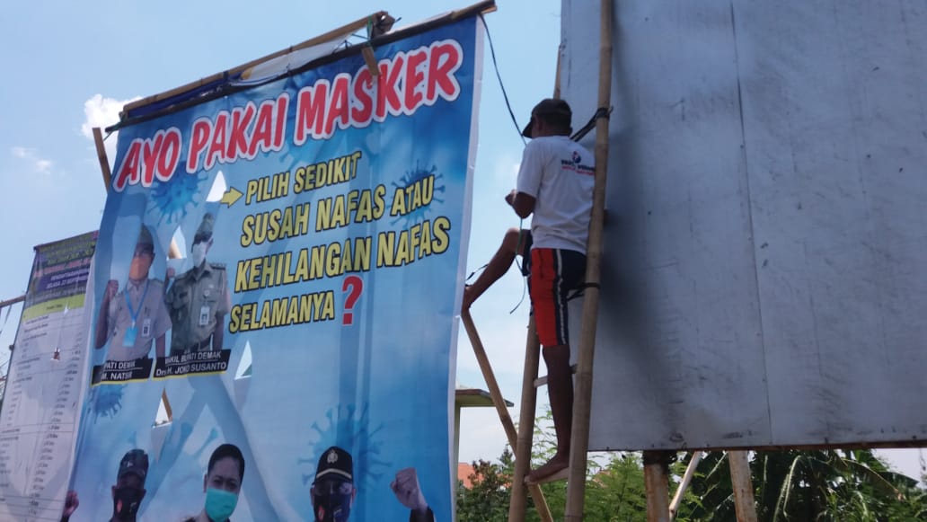 Wedung – Senin, tanggal 07 September 2020 jam 09.00 telah dipasang umbul-umbul Gerakan Ayo Memakai Masker yang di prakarsai oleh Kantor Kecamatan Wedung dan Pemerintah Desa Ngawen, lokasi pemasangan umbul-umbul bertempat di perempatan Puncu Desa Ngawen yang merupakan tempat strategis karena jalan masuk wilayah Kecamatan Wedung, Pemasangan ini merupakan instruksi dari Bapak Bupati Demak agar seluruh Kecamatan memasang umbul-umbul gerakan Ayo Memakai Masker dengan tujuan untuk mencegah penyebaran virus Covid 19 yang masih mewabah di Kabupaten Demak, pemasangan ini rencana akan disebar ke 3 titik di Kecamatan Wedung yang pertama di Desa Ngawen Perempatan Puncu, Desa Kedungmutih, dan Desa Jungsemi. Semoga dengan di pasangkan umbul-umbul Gerakan Ayo Memakai Masker warga bisa lebih tertib lagi dalam memakai masker untuk mencegah penyebaran virus Covid 19.