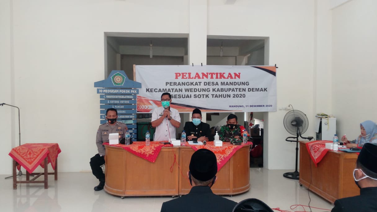 Wedung – Jumat, tanggal 11 Desember 2020 jam 08.00 bertempat di Ruang Pertemuan Balai Desa Mandung diadakan kegiatan Pelantikan Perangkat Desa sesuai SOTK baru berdasarkan Perda Kab.Demak Nomor 7 Tahun 2020, kegiatan ini dipimpin oleh Camat Wedung, Kasi Tata Pemerintahan Kecamatan Wedung dan didampingi oleh Kepala Desa Mandung dan diikuti oleh seluruh Perangkat Desa Mandung, Semoga dengan pelantikan perangkat baru ini pemerintah Desa Mandung menjadi lebih segar lagi dan bersemangat dalam melayani masyarakat.