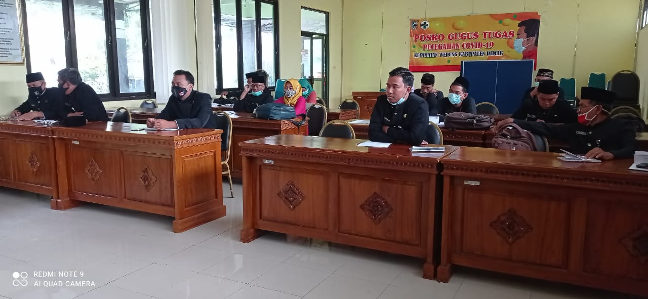 Wedung – Senin, tanggal 28 Desember 2020 jam 08.00 bertempat di Ruang Pertemuan Kecamatan Wedung didakan Rapat Koordinasi rutin Sekretaris Desa se Kecamatan Wedung, kegiatan ini di pimpin oleh Camat Wedung Mulyanto,AP,M.Si didampingi Kasi Tata Pemerintahan Samawi,SIP,MH dan diikuti seluruh Sekretaris Desa se Kecamatan Wedung, kegiatan ini rutin dilakukan setiap hari Senin setelah apel pagi, tujuan diadakan kegiatan ini adalah untuk mengevaluasi dan memberikan pengarahan dalam hal pengelolaan Desa, Camat Wedung Mulyanto,AP,M.Si mengatakan bahwa Sekretaris Desa memegang peranan penting dalam pengelolaan Pemerintahan Desa.