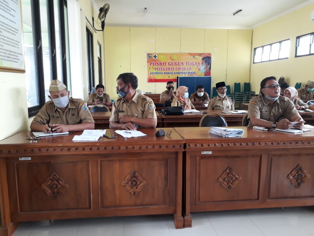 Wedung – Senin, tanggal 21 Desember 2020 jam 08.00 bertempat di Ruang Pertemuan Kecamatan Wedung didakan Rapat Koordinasi rutin Sekretaris Desa se Kecamatan Wedung, kegiatan ini di pimpin oleh Camat Wedung Mulyanto,AP,M.Si didampingi Kasi Tata Pemerintahan Samawi,SIP,MH dan diikuti seluruh Sekretaris Desa se Kecamatan Wedung, kegiatan ini rutin dilakukan setiap hari Senin setelah apel pagi, tujuan diadakan kegiatan ini adalah untuk mengevaluasi dan memberikan pengarahan dalam hal pengelolaan Desa, Camat Wedung Mulyanto,AP,M.Si mengatakan bahwa Sekretaris Desa memegang peranan penting dalam pengelolaan Pemerintahan Desa.