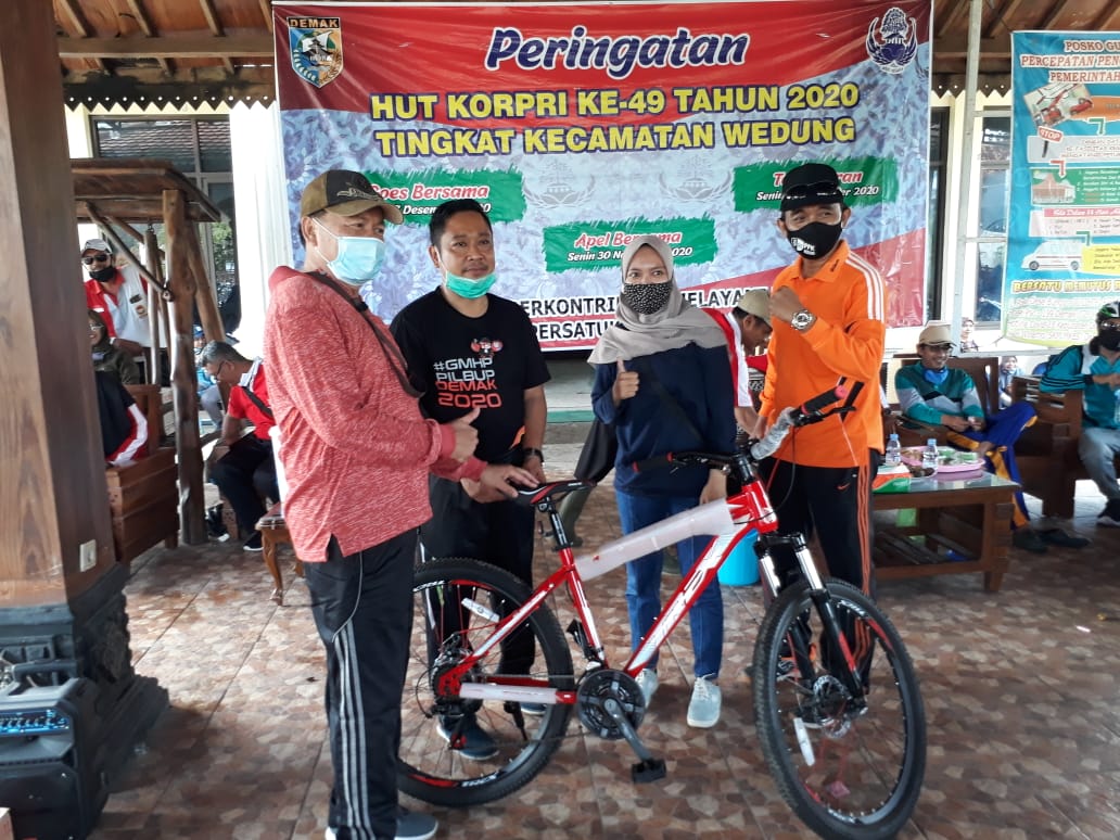 Wedung – Jumat, tanggal 18 Desember 2020 jam 07.00 bertempat di Pendopo Balai Desa Bungo Kecamatan Wedung diadakan kegiatan Gowes Bersama dalam rangka peringatan Hut Korpri ke 49 tahun 2020 yang diikuti oleh Forkopimcam,Karyawan/karyawati, Kepala Desa,Perangkat Desa, Dinas/Instansi,UPK, PKH se Kecamatan Wedung. Kegiatan ini dibuka oleh Bapak Camat Wedung Mulyanto,AP,M.Si didampingi oleh Kapolsek dan Danramil Wedung serta disaksikan oleh seluruh Peserta Gowes Bersama peringatan HUT Korpri ke 49, semoga dengan dilaksanakanya kegiatan Gowes bersama ini seluruh aparatur Pemerintah Kecamatan Wedung bisa lebih sehat dan solid dalam melayani masyarakat Wedung.