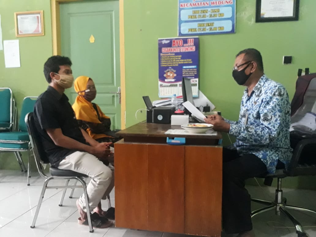 Wedung – Kamis, tanggal 17 Desember 2020 jam 09.00 bertempat di Ruang Kerja Kantor Kecamatan Wedung didakan Pembinaan kepada warga yang akan mengajukan ijin pernikahan di wilayah Kecamatan Wedung, Kegiatan ini dilakukan untuk menekan penyebaran virus covid 19 yang ada di wilyah Kecamatan Wedung, yang salah satu kegiatanya adalah memberikan pembinaan atau sosialisasi tentang tata cara pernikahan yang sesuai protokol kesehatan covid 19, seperti mencuci tangan pakai sabun, memekai masker, menjaga jarak, dan maksimal orang yang datang 10 orang, semoga dengan diterapkanya protokoler kesehatan ini bisa menekan angka penyebaran virus covid 19.