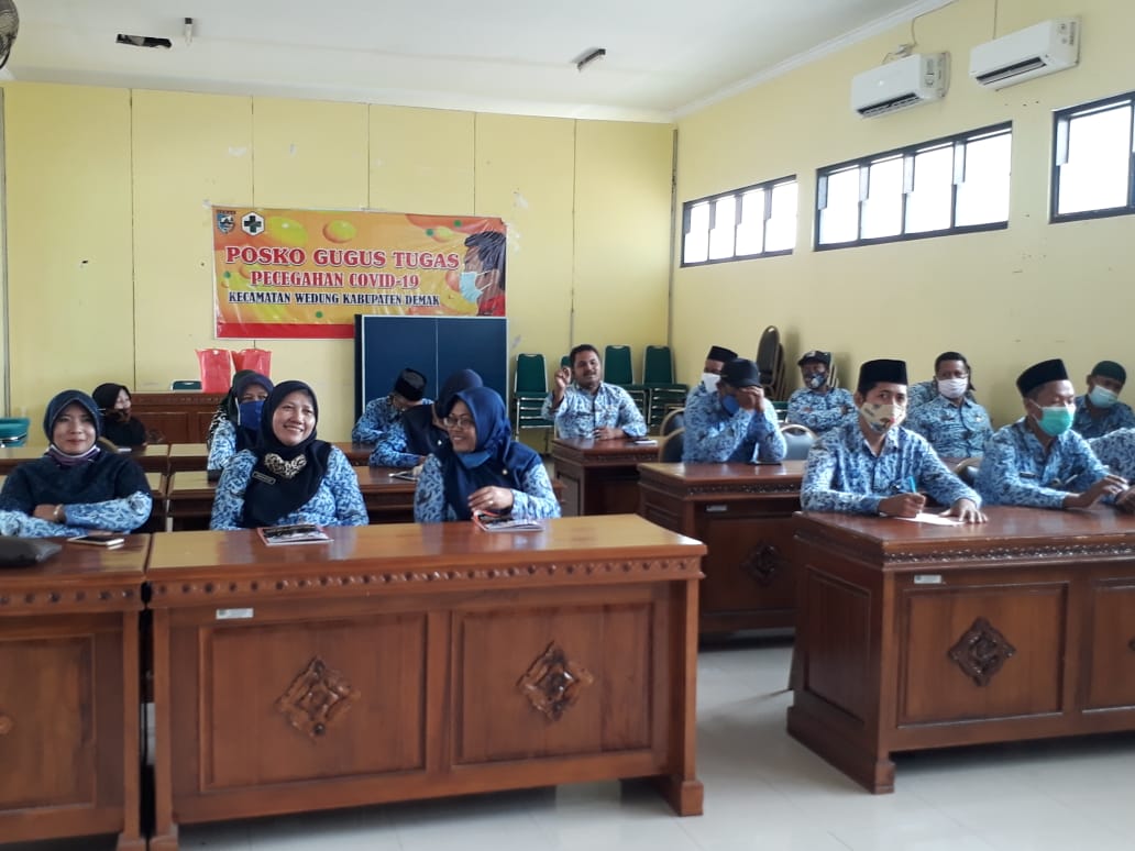 Wedung- Kamis, tanggal 17 Desember 2020 jam 08.00 bertempat di Ruang Pertemuan Kecamatan Wedun didakan Rapat Koordinasi rutin bendahara Desa se Kecamatan Wedung, kegiatan ini di pimpin oleh Camat Wedung Mulyanto,AP,M.Si didampingi Kasi Tata Pemerintahan Samawi,SIP,MH dan Kasi Pemberdayaan Masyarakat Suharto, SE,MAP dan diikuti seluruh Bendahara Desa se Kecamatan Wedung, kegiatan ini rutin dilakukan setiap hari kamis setelah apel pagi, tujuan diadakan kegiatan ini adalah untuk mengevaluasi dan memberikan pengarahan dalam hal pengelolaan keuangan Desa, Sekcam Wedung Drs.Akhmad Suyud,MH mengatakan bahwa Bendahara Desa memegang peranan penting dalam pengelolaan Pemerintahan Desa karena kalau diDesa sistem pengelolaan keuanganya kacau maka otomaatis pemerintahanya akan kacau juga maka dari itu pengelolaanya harus sesuai dengan