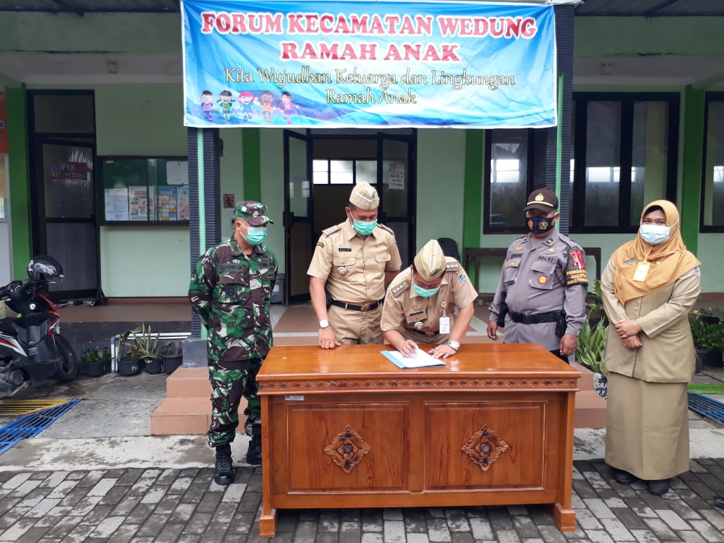 Wedung – Senin, tanggal 14 Desember 2020 jam 09.00 bertempat di Halaman Kantor Kecamatan Wedung didakan penandatanganan Deklarasi Kecamatan Wedung Layak Anak yang diikuti oleh Camat Wedung Mulyanto,AP,M.Si, Kapolsek Wedung, Danramil Wedung, Kepala Puskesmas Wedung 1 dan 2, Korwil Dikbud Wedung dan Perwakilan Kepala Desa se Kecamatan Wedung. Kegiatan ini merupakan komitmen yang dilaksanakan Pemerintah Kecamatan Wedung untuk mewujudkan Kecamatan Wedung menjadi Kecamatan Layak Anak, sesuai dengan perintah Bapak Bupati yang mengiginkan Kabupaten Demak sebagai Kabupaten Layak Anak.