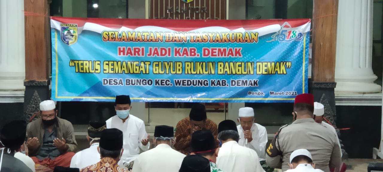 Pada hari Sabtu, tanggal 27 Maret 2021 jam 19.30 bertempat di Balai Desa Bungo Kecamatan Wedung diadakan Selamatan dan Doa Bersama Peringatan Hari Jadi Kabupaten Demak ke 518 Tahun 2021 tingkat Kecamatan Wedung, dimana ditahun ini dengan tema Terus Semangat Guyub Rukun Mbangun Demak, kegiatan ini dipimpin oleh Kepala Desa Bungo didampingi Babinsa dan Babinkamtibmas Desa Bungo dan diikuti oleh Ketua RT/RW, Tokoh Agama dan Tokoh Masyarakat di Desa Bungo Kecamatan Wedung, dan sesuai edaran Bapak Sekretaris Daerah Acara ini juga dilaksanakan oleh 20 Desa se Kecamatan Wedung, dalam acara ini diawali dengan pembukaan oleh Kepala Desa Bungo Slamet, S.Sos.I yang memoivasi kepada seluruh jajaran Pemerintahan Desa Bungo agar lebih semangat lagi dalam melayani dan mengayomi masyarakat, karena sebagai aparat pemerintah kita adalah kepanjangan tangan dari pemerintah pusat untuk itu kita harus saling berkordinasi dan bekerjasama dalam mewujudkan kota Demak yang lebih baik lagi.