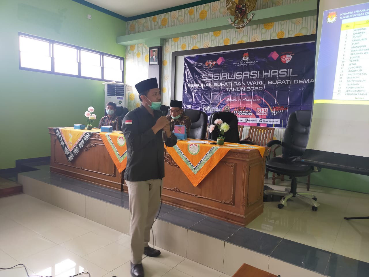 Wedung – Selasa, tanggal 16 Maret 2021 jam 10.00 bertempat di Ruang Pertemuan Kantor Kecamatan Wedung didakan Kegiatan Sosialisasi Pilbup dan Wabup oleh KPU Kabupaten Demak bekerja sama dengan Kantor Kecamatan Wedung yang diikuti oleh Sekcam Wedung, Forkopimcam,seluruh Kepala Desa se Kecamatan Wedung dan lembaga ormas di Kecamatan Wedung dinarasumberi oleh Ketua KPU Kabupaten Demak isi dari Sosialisasi ini adalah evaluasi mengenai pelaksanaan Pemilihan Bupati dan Wakil Bupati Kabupaten Demak tahun 2020 kemarin, tentang pelaksanaan,transparasi, dan kesiapan dalam pemilihan Bupati dan Wakil Bupati Demak, semoga dengan diadakanya evaluasi ini KPU Kabupaten Demak bisa lebih baik lagi dalam pelaksanaan Pesta Demokrasi.