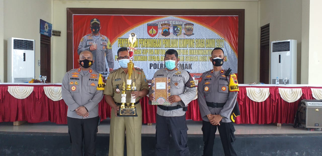 Wedung – Senin, tanggal 08 Maret 2021 jam 08.00 bertempat di Ruang Pertemuan Polres Demak didakan Pengumuman Juara Kampung Siaga Candi tingkat Kabupaten demak, berdasarkan penilaian menetapkan Desa Mutih Wetan sebagai Juara 1 Kampung Siaga Candi tingkat Kabupaten Demak, penyerahan penghargaan diserahkan langsung oleh Kapolres Demak kepada Kepala Desa Mutih Wetan Supriyanto, semoga dengan diberikanya pernghargaan ini bisa mendorong desa-desa yang lain untuk lebih semangat lagi dalam menerapkan kampung siaga candi tingkat Desa dengan tujuan untuk menekan penyebaran virus covid 19.