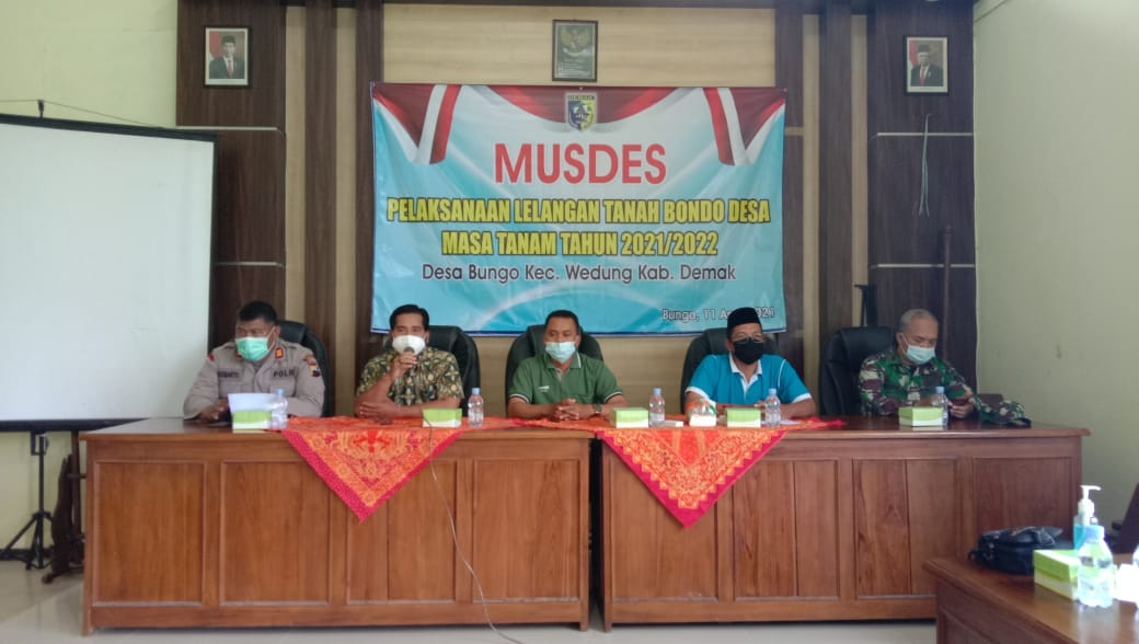 Wedung – Minggu, tanggal 11 April 2021 jam 09.00 bertempat di Ruang Pertemuan Desa Bungo Kecamatan Wedung diadakan Lelang Bondo Desa Bungo, kegiatan ini dihadiri langsung oleh Kasi Trantib Mahmud Royad, SE, serta di dampingi Kapolsek, Danramil Wedung , Kepala Desa Mutih Wetan dan dihadiri para juru lelang warga Desa Bungo, semoga lelang tahun ini hasilnya bisa meningkat dari tahun kemarin dan hasilnya bisa digunakan untuk kemakmuran Desa Bungo