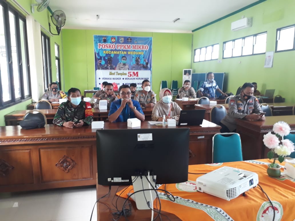 Wedung – Selasa, tanggal 06 April 2021 jam 13.00 bertempat di Ruang Pertemuan Kantor Kecamatan Wedung didakan Kegiatan Zoom Meting Pelatihan Penggunaan Aplikasi dan Dashboard Terintegrasi PPKM Mikro berbasis Desa, yang diikuti oleh Sekretaris Kecamatan Wedung, Kapolsek, Danramil, Kasi Kesra Kecamatan Wedung, Puskesmas Wedung 1, Puskesmas Wedung 2 dan Babinsa / Babinkamtibmas Kecamatan Wedung, isi dari kegiatan ini adalah Pelatihan bagi Babinsa dan babinkamtibmas dalam menggunakan Aplikasi dan Dashboard Terintegrasi PPKM Mikro agar memudahkan dalam pemantauan pelaksanaan PPKM Mikro di Desa sehingga lebih efektif dalam pencegahan penyebaran virus covid 19.