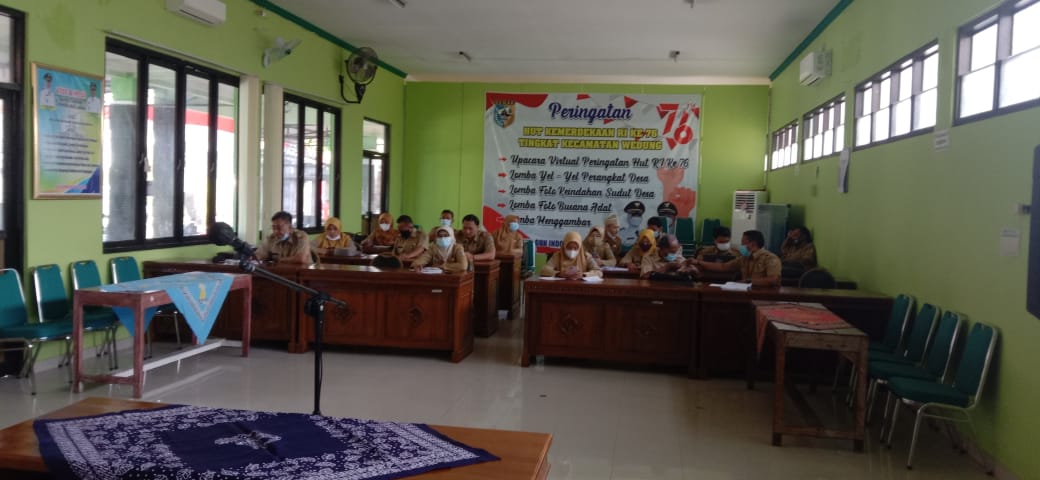 Pada hari Senin, tanggal 30 Agustus 2021 jam 07.30 bertempat di Halaman kantor Kecamatan Wedung didakan Apel Pagi yang dipimpin oleh Camat Wedung dan diikuti oleh seluruh Karyawan Kecamatan Wedung dan Perangkat Desa se Kecamatan Wedung, Camat Wedung mengingatkan kepada seluruh peserta apel bahwa tahun 2021 tinggal 4 bulan lagi maka dari itu tugas-tugas di tahun 2021 harus segera diselesaikan semua jangan sampai kelewat tahun 2021 atau menumpuk di akhir tahun.