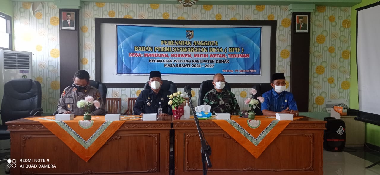 Pada hari Selasa, tanggal 10 Agustus 2021 jam 12.30 bertempat di Ruang Pertemuan Kantor Kecamatan Wedung didakan Rapat Peresmian Anggota Badan Permusyawaratan Desa (BPD) untuk Desa Tedunan, Mutih Wetan, Mandung dan Ngawen, Peresmian ini dipimpin oleh Camat Wedung Mulyanto, AP,M.Si didampingi Forkopimcam Kecamatan Wedung dan Kepala Desa Tedunan, Mutih Wetan, Mandung dan Ngawen serta dihadiri oleh Calon anggota BPD Desa yang terpilih, Camat Wedung menyampaikan bahwa Anggota BPD harus bisa bekerjasama dengan Pemerintah Desa agar terwujudnya Pemerintahan Desa yang lebih maju dan Sejahtera.