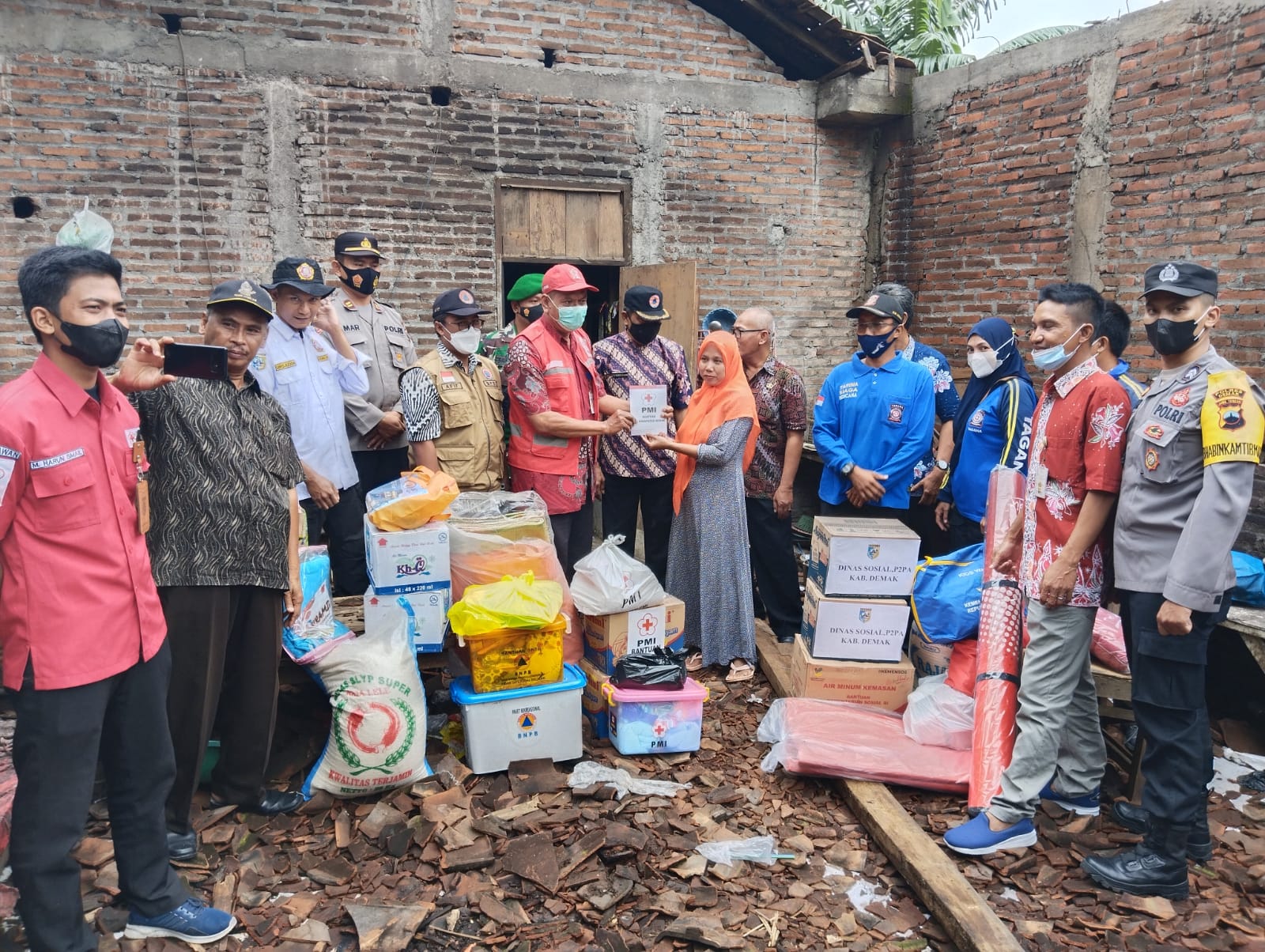 Wedung – Kamis tanggal 10 Maret 2022 jam 10.00 bertempat di Desa Mutih Kulon Kecamatan Wedung, disalurkanya Bantuan Sembako dari Dinas Sosial P2PA, PMI, BPBD dan BAZNAS, bantuan ini ditujukan untuk Bapak Sugijo korban rumah roboh yang diakibatkan Hujan Deras dan angin yang terjadi pada hari Senin, 07 Maret 2022, yang mengakibatkan kerugian kurang lebih Rp.20.000.000, penyerahan bantuan ini dihadiri oleh Sekcam Kecamatan Wedung, Kasi Kesra Kecamatan Wedung, Babinsa, Babhinkaptibnas, Kepala Desa Mutih Kulon, TKSK Wedung dan anggota Tagana Desa Mutih Kulon. Sehingga dengan diberikanya bantuan Rumah Roboh ini bisa meringankan beban korban dan Keluarga