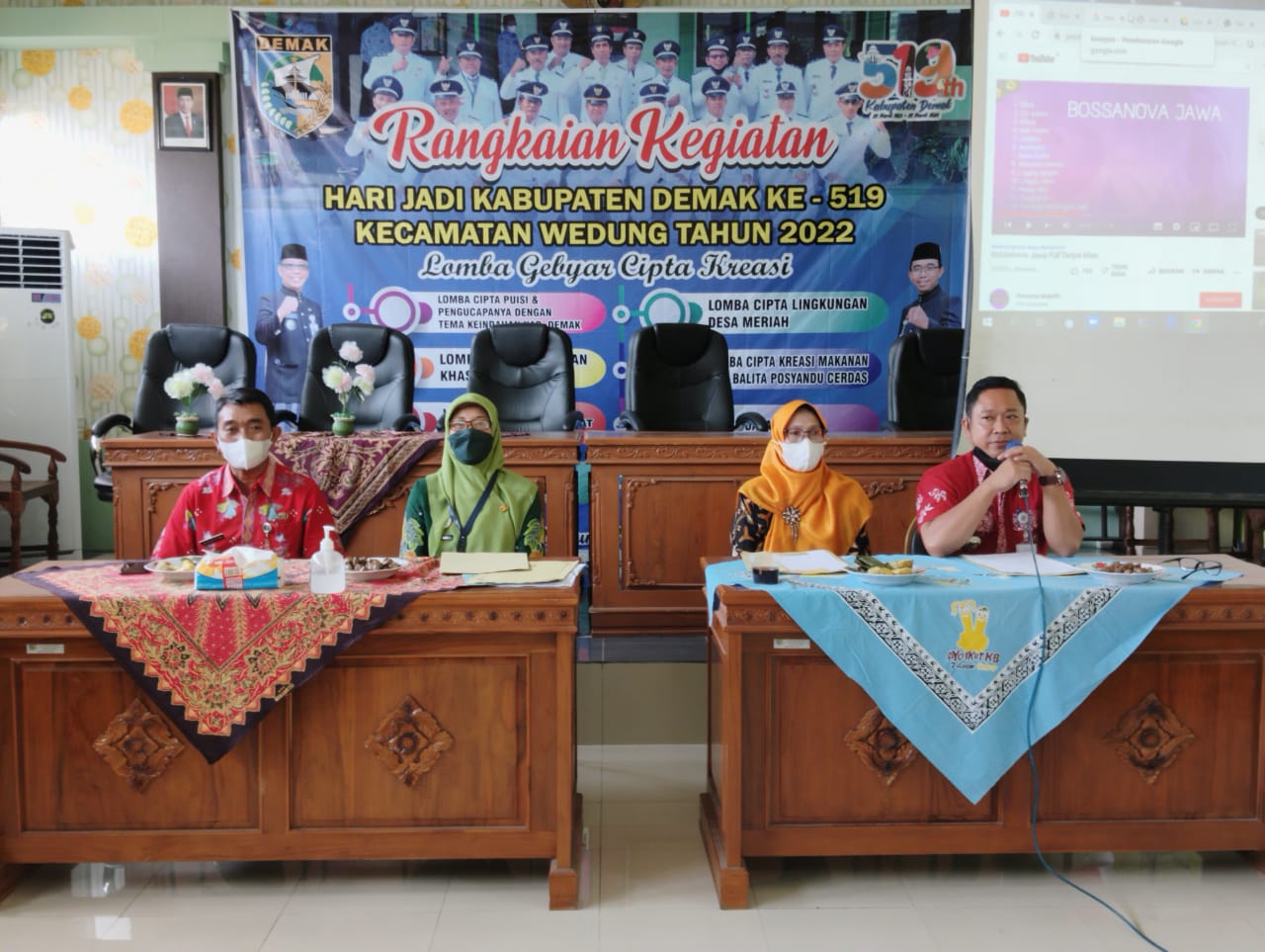 Wedung – Rabu tanggal 16 Maret 2022 jam 10.00 bertempat di Ruang Pertemuan Kantor Kecamatan Wedung, diadakanya Pembukaan kegiatan lomba cipta masakan khas wedung dalam rangka memperingati Hari Jadi Kabupaten Demak ke 519, kegiatan ini di buka langsung oleh Bapak Camat Wedung dan diikuti oleh seluruh Desa se Kecamatan Wedung, adapun tata cara perlombaanya yaitu peserta langsung membawa masakan khas wedung yang sudah masak untuk disajikan di Ruang Pertemuan kantor Kecamatan Wedung, setelah itu akan dinilai oleh tiga juri yang terdiri dari Bapak Camat Wedung Mulyanto, AP,M.Si, Ibu Endah Pengawas Madrasah dan Ibu luluk dari Dinas Pariwisata Kabupaten Demak, untuk Desa yang tidak mengirimkan akan dikenakan denda sebesar Rp.250.000.