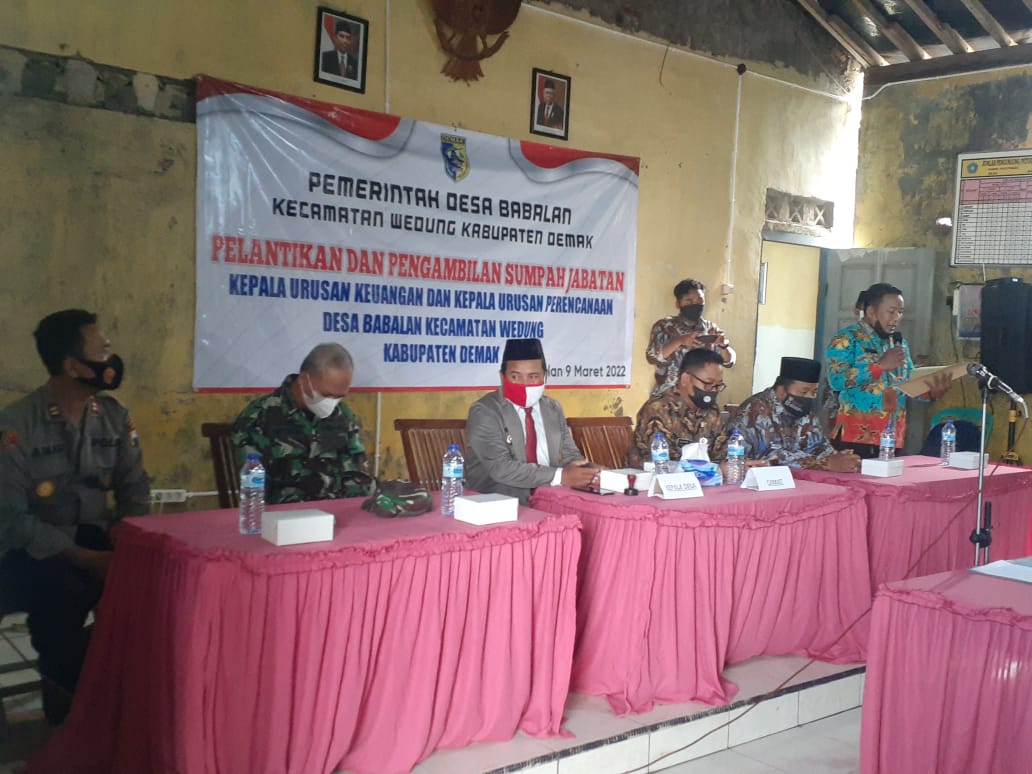 Wedung – Rabu, tanggal 09 Maret 2022 jam 08.00 bertempat di Ruang Pertemuan Balai Desa Babalan Kecamatan Wedung diadakan kegiatan Pelantikan Perangkat Desa Baru jabatan kaur Keuangan dan kaur Keuangan, yang telah dilaksanakan seleksi sesuai dengan undang-undang yang berlaku, kegiatan ini dipimpin oleh Camat Wedung, Kasi Trantib dan PU dan didampingi oleh Kepala Desa Babalan dan diikuti oleh seluruh Perangkat Desa Babalan, serta disaksikan oleh anggota BPD Desa Babalan, dengan dilantiknya perangkat baru ini menjadikan kekosongan Perangkat Desa Babalan sudah terpenuhi, semoga pengisian Perangkat Desa ini bisa membuat pelayanan di Desa Babalan semakin maksimal dan amanah.