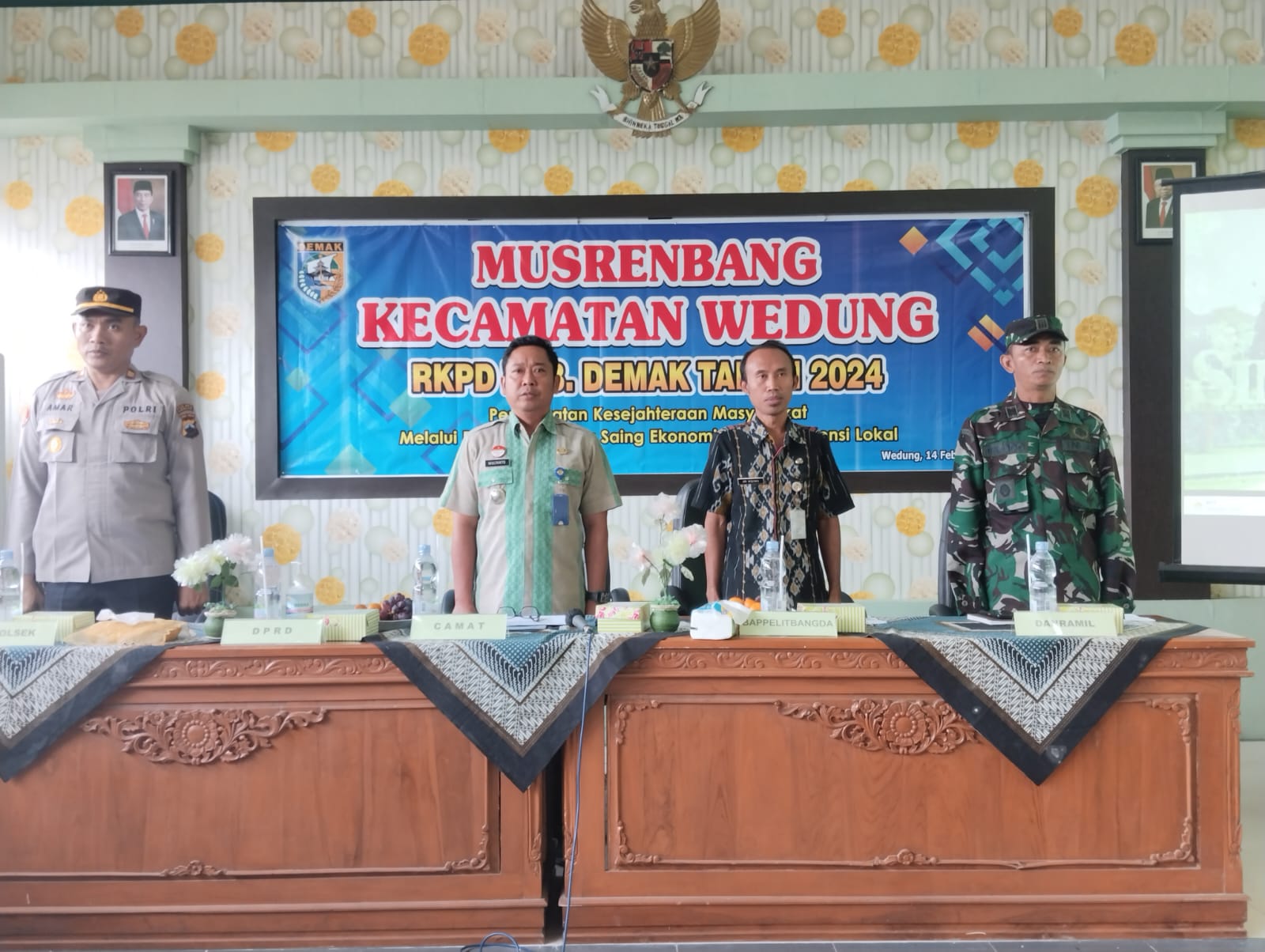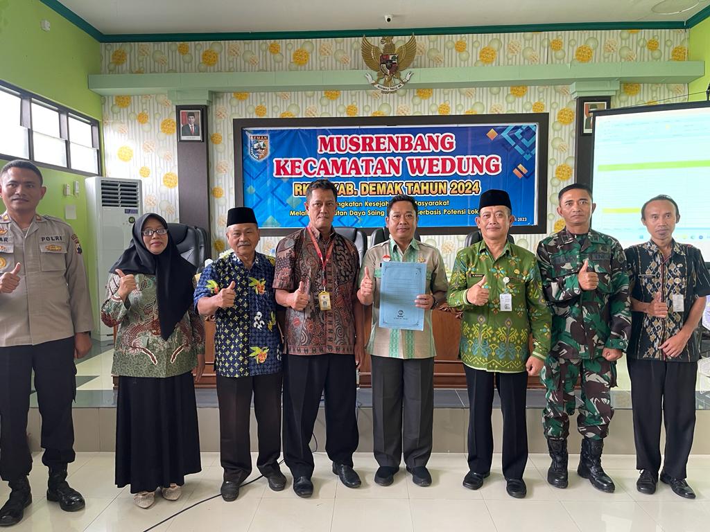 Wedung – Selasa, tanggal 14 Februari 2023 jam 08.00 bertempat di Ruang Pertemuan Kantor Kecamatan Wedung didakan Kegiatan Musyawarah Perencanaan Pembangunan tingkat Kecamatan Wedung tahun 2023 RKPD Kabupaten Demak Tahun 2024 yang difasilitasi oleh Kantor Kecamatan Wedung bagian Kasi Pemberdayaan Masyarakat, kegiatan diikuti oleh Camat Wedung, Forkopimcam, Kepala Dinas/Instansi Tingkat Kecamatan Wedung, Kepala Desa beserta Ketua BPD Desa se Kecamatan Wedung, Tokoh Agama dan Tokoh Masyarakat, Kegiatan kali ini dihadiri oleh Bapak Ari Wibowo, ST Kabid Perencanaan Bappelitbangda Kabupaten Demak, Bapak Camat Wedung Mulyanto, AP,M.Si mengatakan kegiatan Musrenbangcam merupakan kegiatan awal dalam perencanaan pembangunan daerah khususnya di Desa, selain itu juga dalam musrenbangcam Kepala Desa harus memprioritaskan pembangunan pelayanan umum, seperti jalan desa, talut, pengelolaan sampah dan tidak lupa pembangunan pemberdayaan masyarakat seperti pelatihan kewirausahaan, pelatihan menjahit dll. Bapak Camat Wedung berharap dengan dilaksanakan Musrenbangcam ini semua usulan Desa bisa ditampung dan bisa masuk kedalam program APBD Daerah Kabupaten Demak sehingga bisa bermanfaat untuk kemajuan desa dan masyarakat.