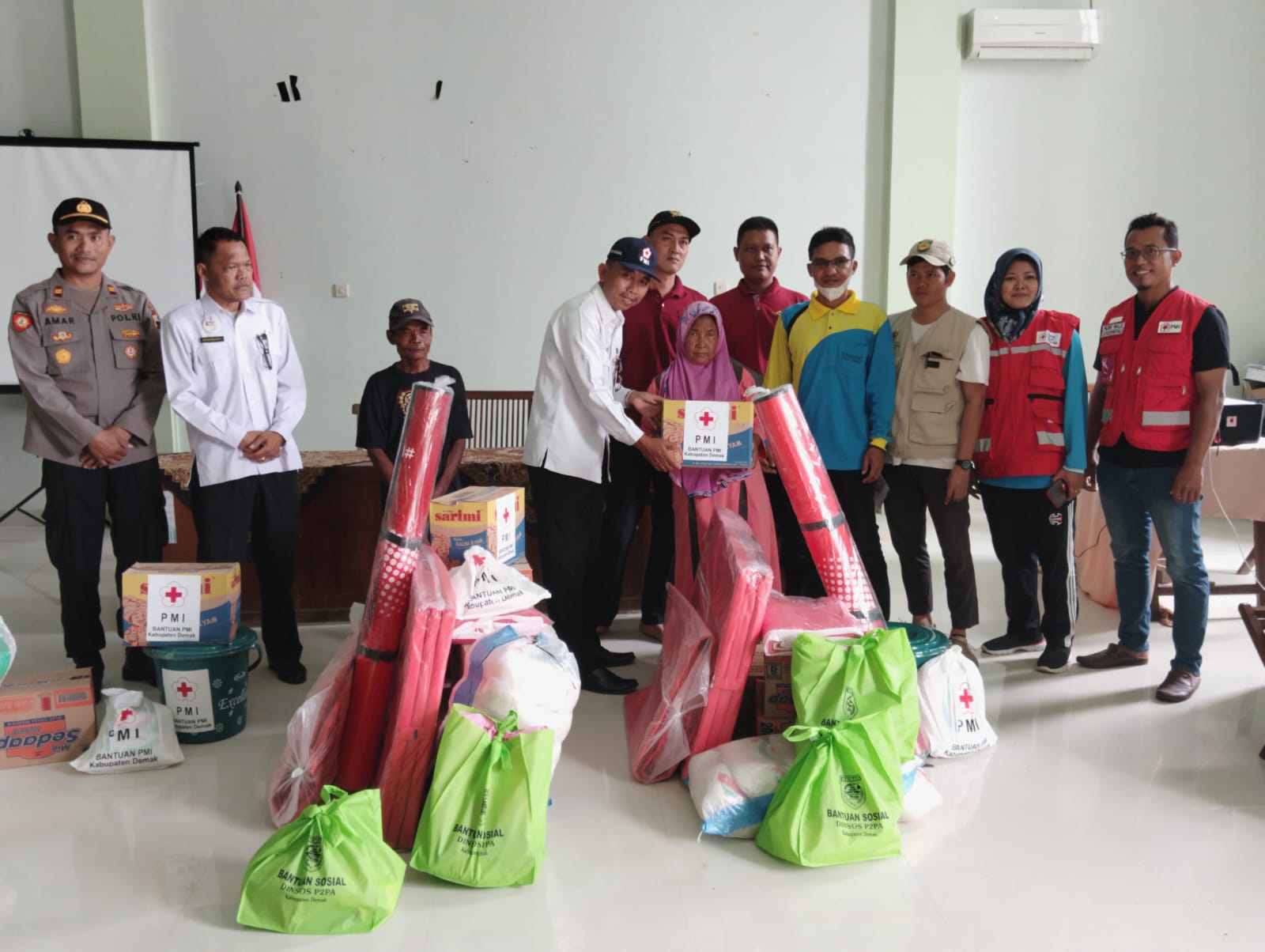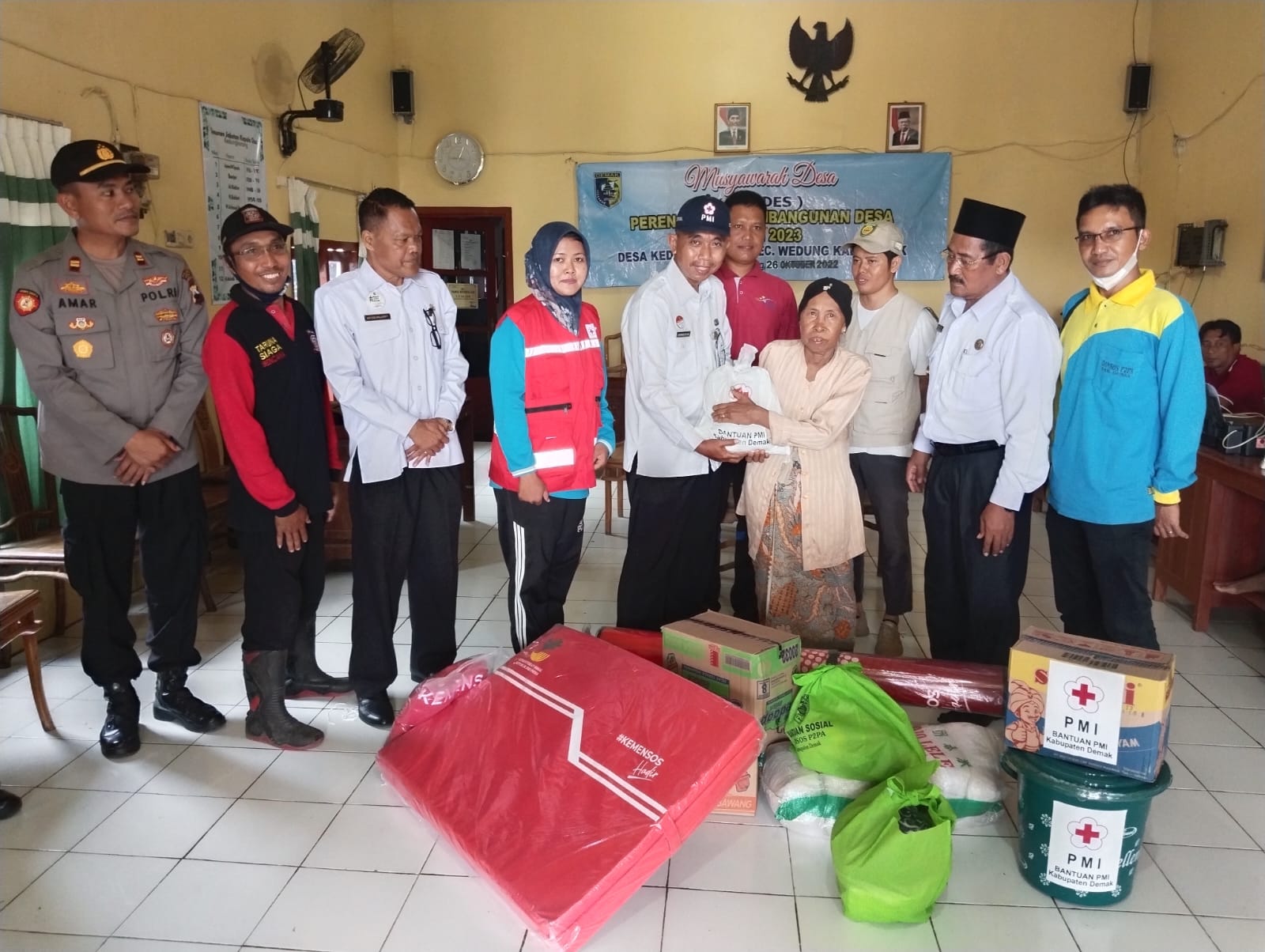 Wedung – Jumat tanggal 31 Maret 2023 jam 11.00 bertempat di Desa Kedungmutih Kecamatan Wedung, disalurkanya Bantuan Sembako dan Akomodasi dari Dinas Sosial P2PA Kabupaten Demak, PMI Kabupaten Demak, dan Baznas Kabupaten Demak bantuan ini ditujukan untuk warga Desa Kedungmutih Kecamatan Wedung yang menjadi korban rumah roboh diakibatkan hujan deras dan angin puting beliung, yang terjadi pada hari Senin, 20 Maret 2023, pukul 16.00 wib, yang mengakibatkan kerugian kurang lebih Rp.30.000.000, penyerahan bantuan ini dihadiri oleh Sekcam Wedung Drs.Akhmad Suyud, MH , Kapolsek Wedung beserta anggota Kepala Desa Kedungmutih dan Perangkat Desa, TKSK Kecamatan Wedung dan Tagana Desa Kedungmutih, adapun bantuan yang diberikan yaitu sembako, tikar, matras, mie instan, dan uang tunai. Sekcam Wedung Drs.Akhmad Suyud, MH mengatakan bahwa pemberian bantuan ini diharapkan bisa meringankan beban para korban walaupun besaranya tidak sebanding dengan kerugianya, dan kepada korban dimohon terus bersabar dan menerima semuanya dengan ikhlas, selain itu Bapak Sekcam juga mengarahkan kepada Pemerintah Desa agar segera membuat surat permohonan bantuan bedah rumah kepada Dinperkim Kabupaten Demak dengan harapan bisa mendapatkan bantuan perbaikan rumah