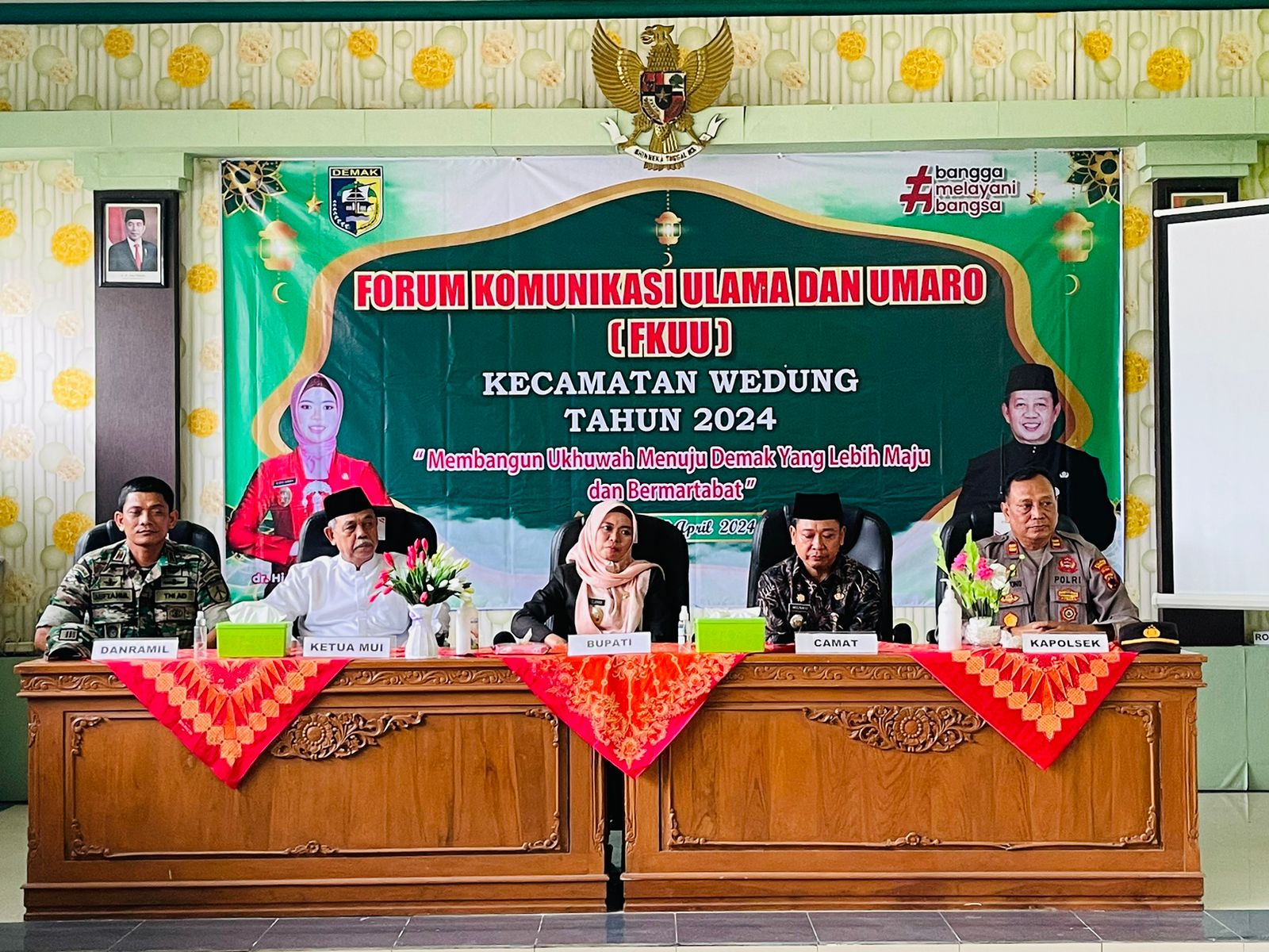 WEDUNG – Selasa, 02 April 2024 jam 12.30 WIB bertempat di Ruang Pertemuan Kantor Kecamatan Wedung didakan Kegiatan Forum Komunikasi Ulama dan Umaro tingkat Kecamatan Wedung dengan teman Membangun Ukhuwah Menuju Demak yang lebih Maju dan Bermartabat, kegiatan ini dihadiri oleh Bupati Demak dr. Hj. Eisti’anah, S.E didampingi Camat Wedung, Kapolsek dan Danramil serta menghadirkan undangan dari Kepala Instansi, Ketua Organisasi Agama, Kepala Desa dan Tokoh Agama, dalam kegiatan kali ini Ibu Bupati berpesan sinergitas antara ulama dan umaro sangatlah penting terutama dalam menghadapi bencana yang terjadi di demak kemarin, maka dari itu marilah kita bersama-sama menjalin kerjasama yang baik antara ulama dan umaro sehingga mewujudkan demak yang bermartabat maju dan sejahtera.