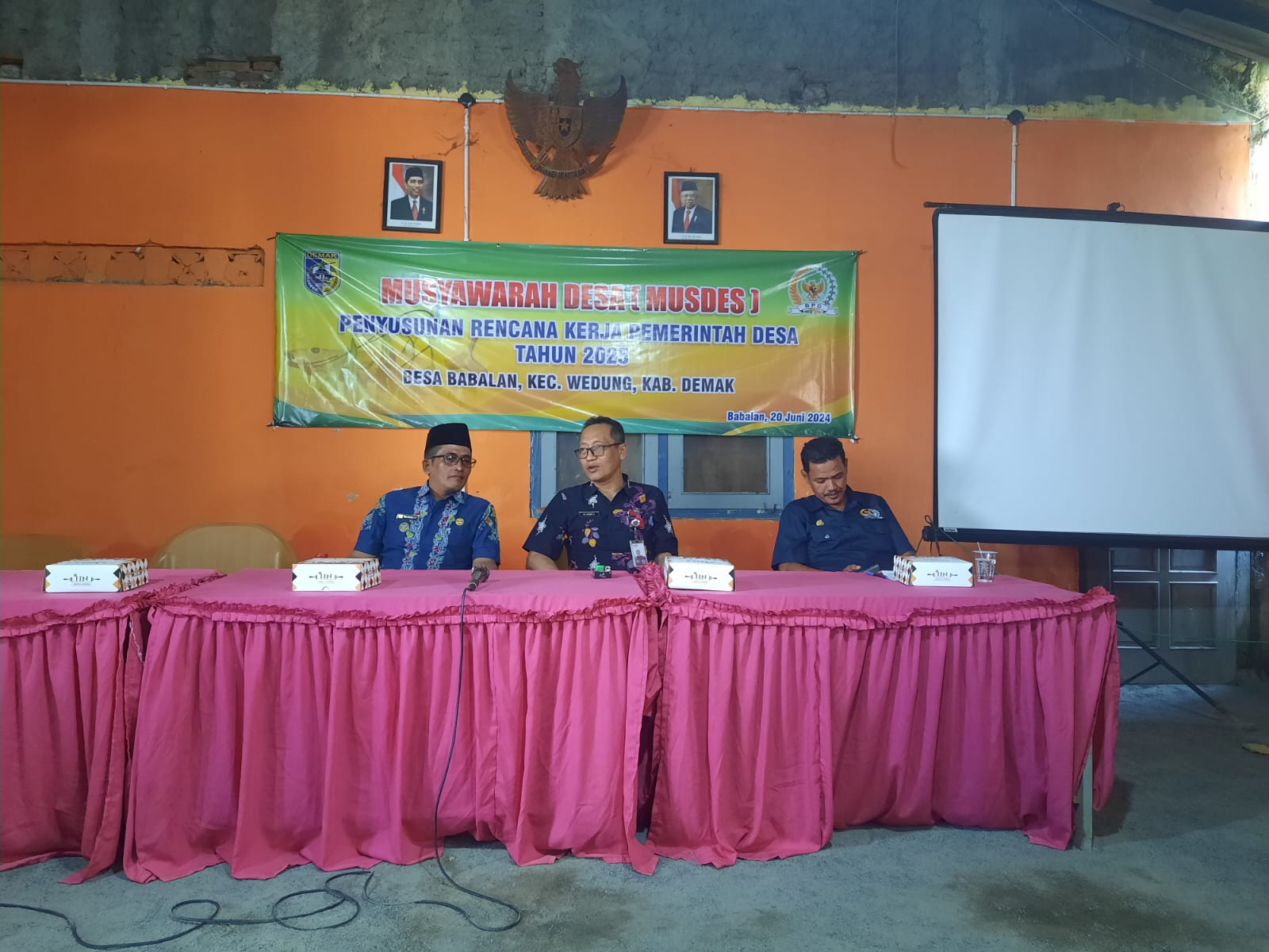 WEDUNG – Kamis, 20 Juni 2024, ada tiga desa di Kecamatan Wedung yang melaksanakan Musyawarah Desa Rencana Kerja Pemerintah Desa (Musdes RKPD) Tahun 2025 yaitu Desa Bungo, Desa Kendalasem dan Desa Babalan yang bertempat di Balai Desa masing-masing, kegiatan ini dihadiri oleh Sekcam Wedung Drs. Akhmad Suyud, MH di Desa Kendalasem, Kasi Permas Suharto, SE, MAP di Desa Bungo dan Kassubag Program & Keuangan M. Agus Supriyadi, SE di Desa Babalan, serta diikuti oleh Perangkat Desa, Anggota BPD dan Perwakilan Tamu undangan dari desa masing-masing.