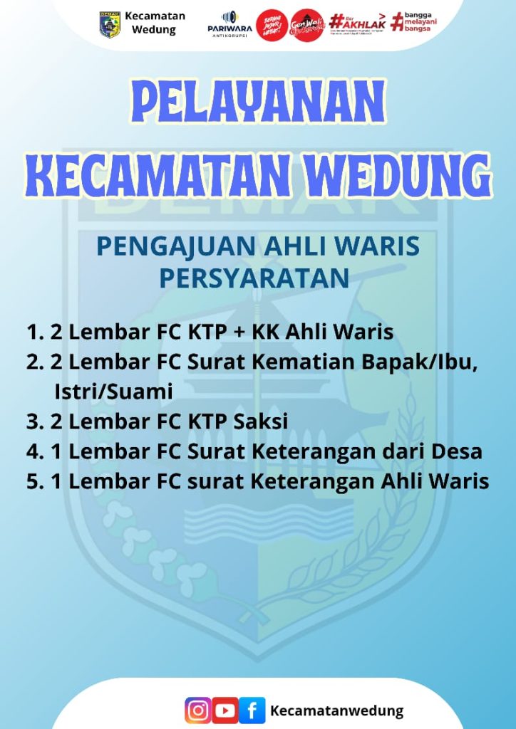 PENGAJUAN AHLI WARIS PERSYARATAN 2 Lembar FC KTP + KK ASLI WARIS 2 Lembar FC SURAT KEMATIAN BAPAK/IBU/SUAMI/ISTRI 2 Lembar FC KTP SAKSI 2 Lembar FC SURAT KETERANGAN DARI DESA 2 Lembar FC SURAT KETERANGAN AHLI WARIS